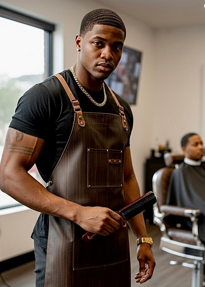 Open media with position 5 in modal popup Barber wearing a brown apron holding a brush in a barbershop.