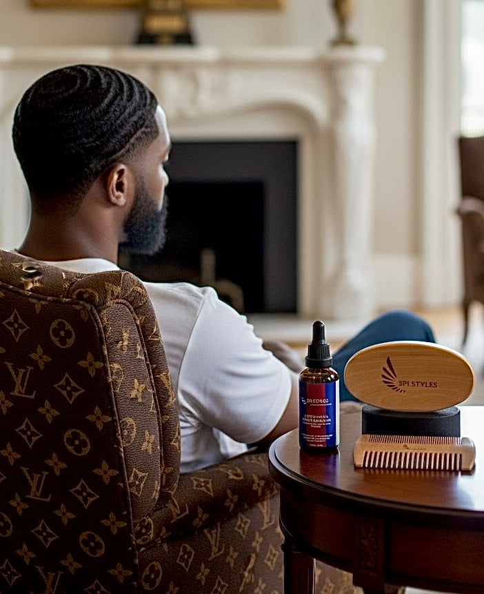 Man sitting on a patterned chair with grooming products on a table in front of him.
