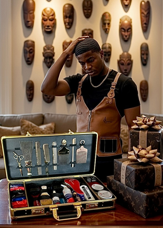 Man in a barber shop with a grooming kit and decorative wall of masks.