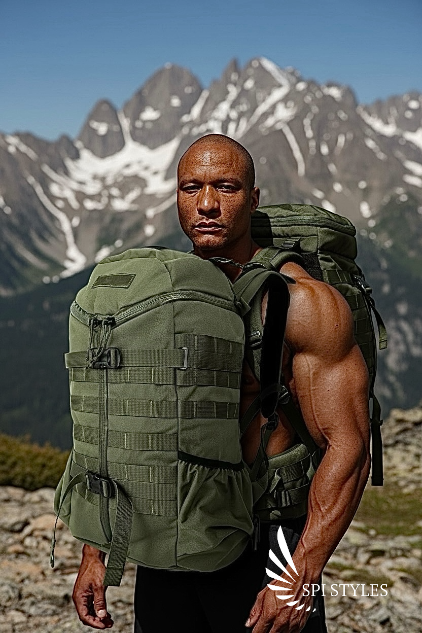 Angled view of the SPI Styles Vanguard TriZip Backpack in green, emphasizing its ergonomic design and tactical features