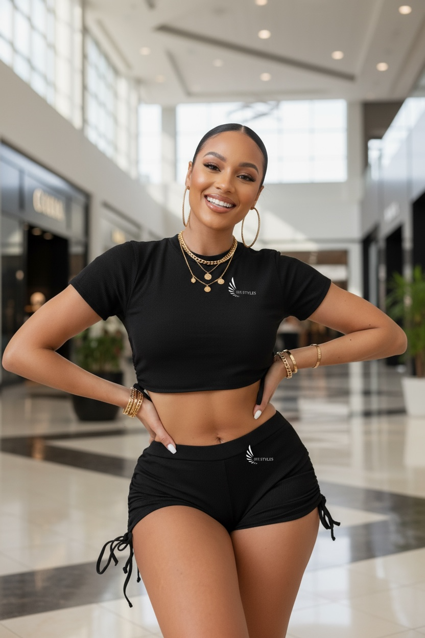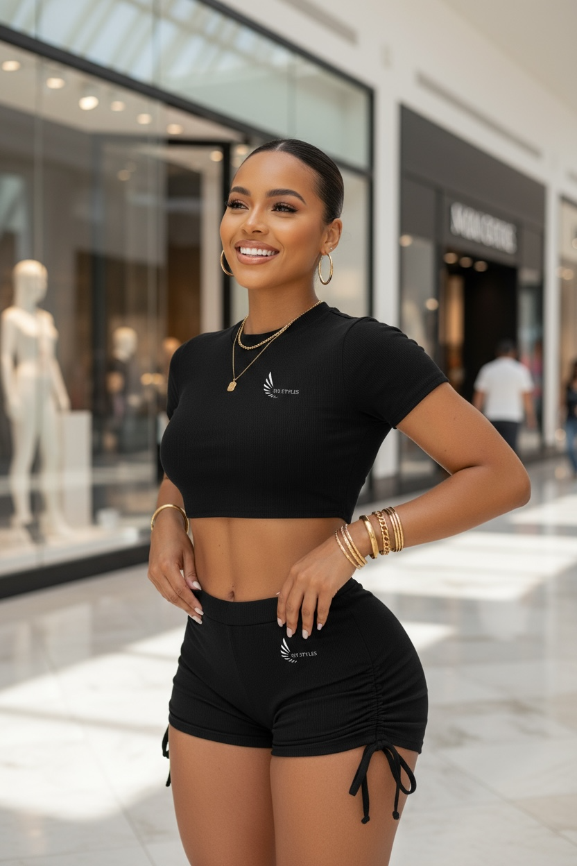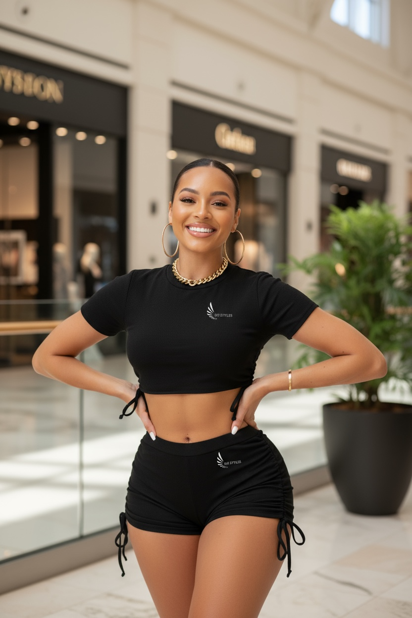 Woman in black athletic wear posing in a mall