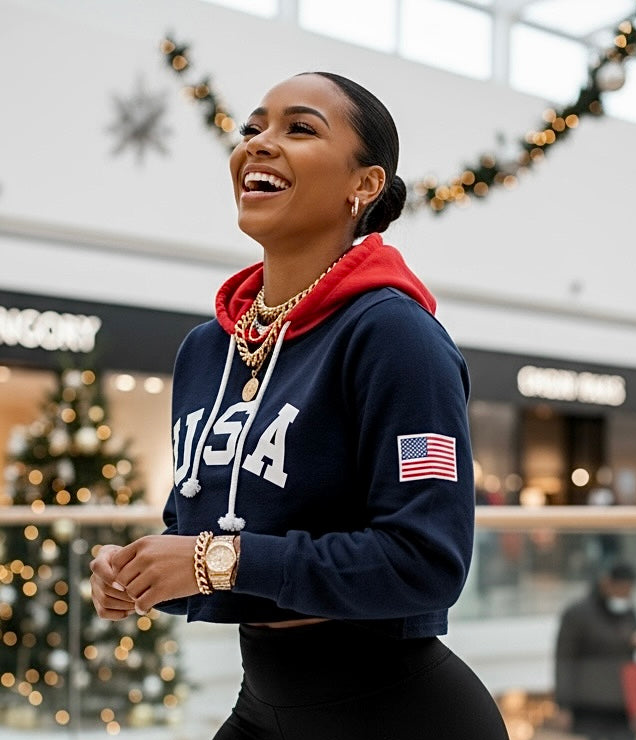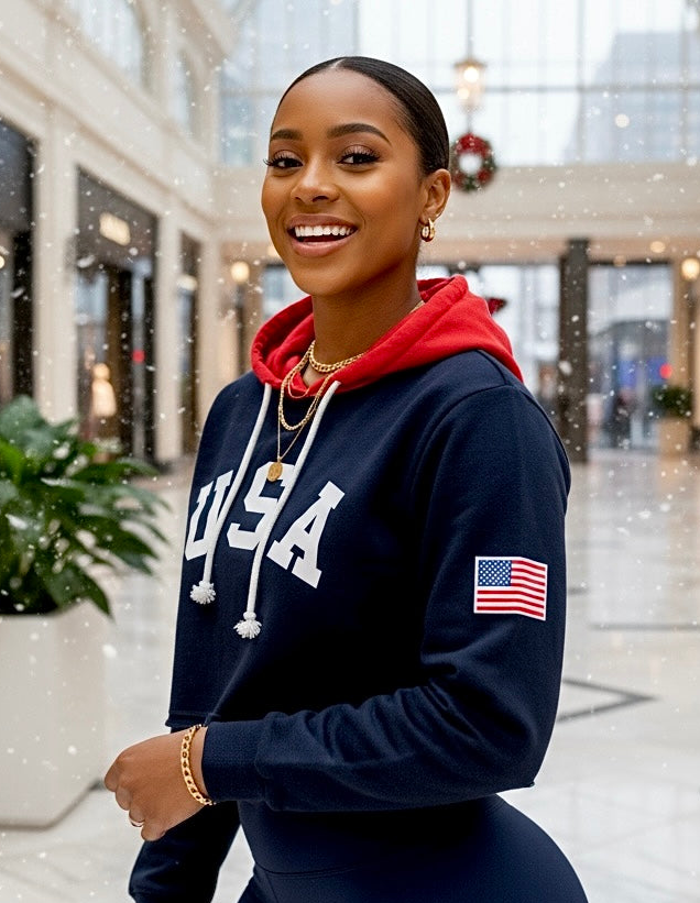Woman wearing a navy hoodie with 'USA' and an American flag, standing in a festive indoor setting.