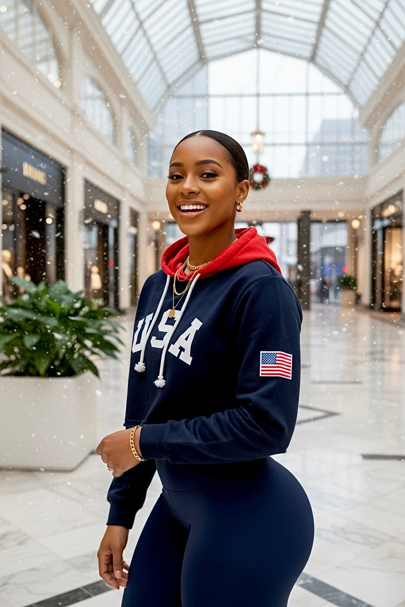 Woman wearing a navy hoodie with 'USA' and an American flag patch in a snowy mall setting.