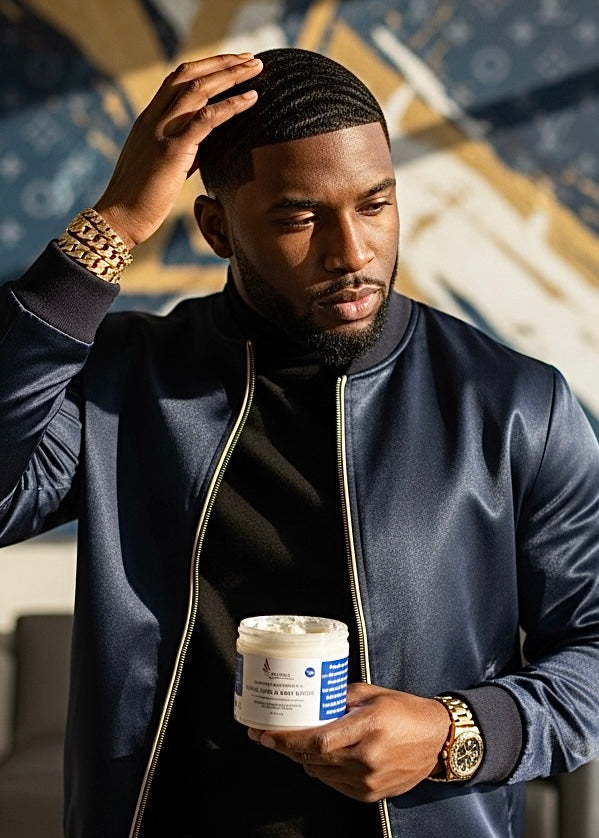 Person holding a jar of SPI Styles Jamaican Black Castor Oil Thick, Curl & Wave Butter against a black background.