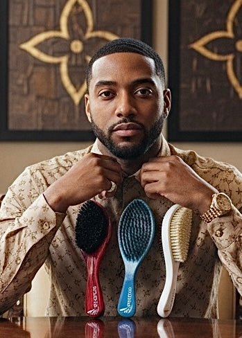 Man adjusting his tie with hairbrushes on a table in front of him, against a decorative wall.