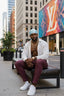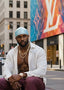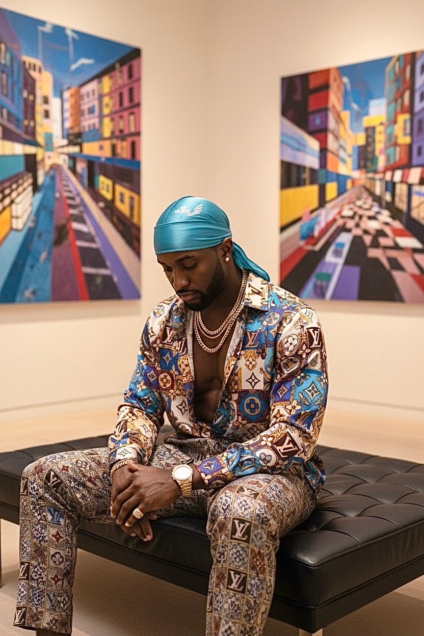 Man wearing a patterned shirt and blue headscarf in an art gallery setting