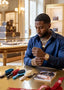 Man in a blue shirt sitting at a table with grooming tools and books.