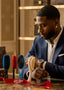 Open media with position 1 in modal popup Man in a blue shirt sitting at a table with grooming tools and books.